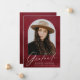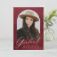 Celebra el logro de tu graduación con esta elegante invitación de graduación que muestra su foto dentro de un elegante marco de arco contra un rico fondo de color burdeos. "Graduado" se muestra bellamente en un moderno guión de caligrafía blanca, con el nombre del graduado, la escuela y el año de graduación que se muestra elegantemente a continuación. La parte posterior de esta invitación de graduación de fotos ofrece un diseño de cuadrícula para seis fotos adicionales, lo que lo hace perfecto para compartir momentos más especiales. Personalice este sofisticado diseño para crear un conservador único para los graduados de la escuela secundaria o universitarios.