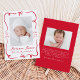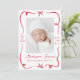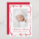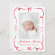 Anuncie la llegada de su bebé con este dulce y festivo anuncio de nacimiento. Una cinta roja dibujada a mano y un arco enmarcan la foto vertical de tu bebé en el frente, con su nombre y los detalles de su nacimiento mostrados en un hermoso guión escrito a mano. La parte posterior incluye una foto horizontal con espacio debajo para su mensaje personal. Este audaz diseño rojo es ideal para Navidades o anuncios de nacimiento del Día de San Valentín, pero lo suficientemente intemporal como para celebrar a su bebé en cualquier época del año.