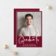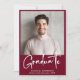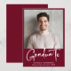 Moderna invitación de graduación de color rojo burdeos que incluye tu foto y "Graduado" en un elegante y audaz guión blanco. Añada el nombre del graduado, el año escolar y el año de clase en una simple tipografía blanca.