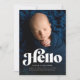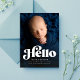 Un audaz "hola" de estilo retro en blanco contra una sola foto vertical hace una manera dulce y elegante de presentar tu recién nacido. Con espacio para el nombre y estadísticas en la parte delantera con la foto, la parte trasera de este anuncio de nacimiento es un azul polvoriento dulce. Perfecto para que los padres nuevos y geniales presenten a su nueva niña con un toque de modernidad. El reverso también incluye espacio para una segunda foto. Este diseño también está disponible como anuncio de nacimiento y descarga digital.