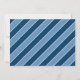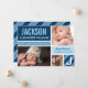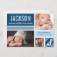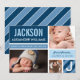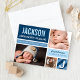 La tarjeta de anuncio de nacimiento de foto moderna y audaz presenta el primer nombre del bebé en tipo de letra grande en un bloque de color azul marino con rayas diagonales, estadísticas de nacimiento en un banner azul claro, y dos fotos en la parte frontal. La parte trasera muestra un diseño de cuadrícula con una tercera foto, un mensaje de "Padres Orgullosos" y una inicial monograma en un bloque rayado. Azul marino, azul claro, azul claro y blanco crean una llamativa paleta de tonos azules. Todos los colores y textos son totalmente personalizables.