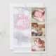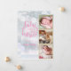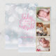 Una elegante tarjeta de anuncio de cumpleaños navideño con 3 fotos enmarcadas en oro para personalizar con tus 3 fotos especiales, mensaje navideño, nombres y estadísticas de nacimiento. La parte posterior presenta copos de nieve que caen. Diseñado por Thisisnotme©