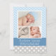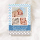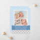La tarjeta de anuncio de nacimiento con foto audaz y juguetona presenta tres fotos de su bebé varón enmarcadas por un patrón de chevron elegante en azul cielo y blanco. El nombre del bebé aparece en escritura de caligrafía en una pancarta azul teal con estadísticas de nacimiento y un mensaje de "Padres Orgullosos" en blanco. La parte posterior está vestida con un patrón de lunares gris y blanco coordinado. Todos los colores y textos son totalmente personalizables.