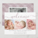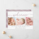 Anuncia la llegada de tu bebé con este moderno anuncio de nacimiento a doble cara. La parte delantera cuenta con un collage de tres fotos de algunas de tus favoritas y BIENVENIDA en una escritura a mano en rosa polvoriento. Personaliza con el nombre de tu bebé, fecha de nacimiento, estadísticas de nacimiento y nombres de los padres.