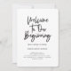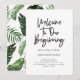 Bienvenidos a nuestra boda de follaje tropical inicial. Con escritura a mano de tendencia y ilustración de follaje botánico tropical en acuarela. Parte de un conjunto completo de boda.
