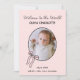 Esta tarjeta de presentación de bienvenida al recién nacido bebe recién nacido en el mundo rosa es moderna y minimalista. La tarjeta totalmente personalizable incluye una foto en la parte delantera con el nombre de su bebé, estadísticas de nacimiento y nombres de sus padres. La parte de atrás muestra un collage de tres fotos. Perfecto para compartir su alegría, este diseño minimalista de coquetas es ideal para anuncios de bebés sin diferencias de género. Celebra a tu recién nacido con esta sencilla y elegante tarjeta de invitación.