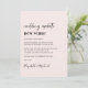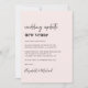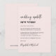 Moda boda rosa claro cambio de invitación del lugar con "boda actualizar nuevo lugar" escrito en un guión contemporáneo y tipografía de moda audaz (se puede personalizar esto a "nueva fecha", "boda más pequeño", etc). Personalice su invitación de cambio de planes, agregue sus nombres en un guión tipo firma y agregue su sitio web boda al revés o deje en blanco.