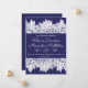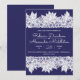 Anuncio de boda azul blanco elegante. Sus detalles están acentuados por bordes superior e inferior dibujados a mano con Dianthus, follaje de lirio del valle y mariquitas. Las tarjetas se invierten a un azul real profundo.