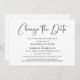 Anuncio minimalista moderno de posposición de boda en blanco y negro. "Cambiar la Fecha" está escrito en una tipografía elegante y puedes personalizar fácilmente con los detalles de la posposición de la boda.