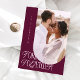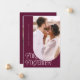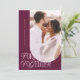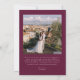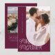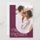 Tarjeta de invitación de boda antigua y elegante con un texto tipográfico mezclado con guiones y fuentes serif que dice "Forever Together" (Juntos por siempre) con una foto en un marco abovedado. El fondo es arándano.
