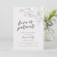 Tarjeta de anuncio de aplazamiento de boda elegante y moderna con una ilustración dibujada a mano de flores de magnolia en colores marfil y gris con un texto en escritura a mano debajo que dice "el amor es paciente."