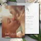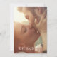 Bonita boda blanca y verde llana SAVE LA tarjeta de invitación DATE con color verde oscuro del bosque, contra un fondo blanco. Esta plantilla muestra una foto de un par con '¡Ella dijo SÍ!' al frente. La parte posterior de la tarjeta incluye toda la información de "Save the Date" y un precioso monograma de pareja en verde suave de menta.