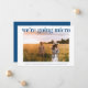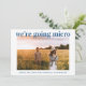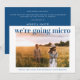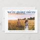 Un anuncio fresco y alegre para informar a su lista de invitados original que las circunstancias han requerido que reduzcan el tamaño de su boda. "nos vamos a micro" está escrito en la parte superior de su foto de compromiso favorita en tipografía azul claro moderna y limpia, y debajo puede personalizar sus nombres y anuncio de reducción. En el reverso, puede personalizar su mensaje con más detalle y agregar cualquier información de transmisión en vivo y sitio web de la boda, todo en tipografía blanca sobre un fondo azul clásico.