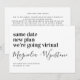 Haga saber a sus amigos y familiares sobre los nuevos planes más pequeños para su boda con este moderno anuncio de boda virtual. Por favor, asegúrese de personalizar el mensaje para incluir la dirección web de su sitio web de boda. O para que sepan cómo pueden ver su boda virtualmente.