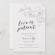 Tarjeta de anuncio de boda pospuesta elegante y moderna con una ilustración dibujada a mano de flores de magnolia en colores marfil y gris con un texto en letra script debajo que dice "el amor es paciente".