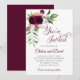 This wedding invitation features a romantic and elegant design, with a rich floral arrangement in burgundy, blush, and green adorning the top corner. The layout is clean and centered, using graceful script and serif fonts to convey a formal tone. Event details are clearly presented, including the date, time, venue, and a note about post-ceremony festivities. The overall aesthetic blends classic charm with celebratory warmth, making it suitable for a traditional church wedding followed by a joyful reception.