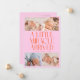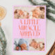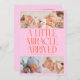 Modern Christmas theme birth announcement card featuring a bold typography text that says "a little miracle arrived" with 4 of your newborn pictures. This is a birth announcement card for the holiday seasons! Add your pictures, birth stats, and a message! The background is orange pink.