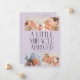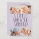 Modern Christmas theme birth announcement card featuring a bold typography text that says "a little miracle arrived" with 4 of your newborn pictures. This is a birth announcement card for the holiday seasons! Add your pictures, birth stats, and a message! The background is purple.