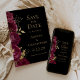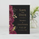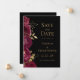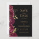 Esta elegante boda moderna, salvo la tarjeta de fecha, tiene un borde de flores borgoñas y hojas de Relieve metalizado de imitación dorada. Personalizar el texto de color dorado sobre un fondo negro. El dorso de la tarjeta es negro sólido.