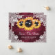 Boda personalizada de girasol rústico burdeos salva las tarjetas de cita con girasoles en un fondo rústico de madera adornado con encajes florales blancos y luces de cuerda. Nuestra morada floral rústica y burdeos, salvo la tarjeta de cita, es perfecta para un campo rústico, o para una fiesta de bodas de granero inspirada en las flores de girasol.