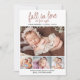 Tarjeta de Anuncio de Nacimiento de Caída en Amor que puedes personalizar con 4 fotos de tu bebé, nombre del bebé, estadísticas de nacimiento y mensajes cortos. La caída en el amor a primera vista está escrita en escritura casual escrita a mano y el diseño tiene una historia de color de tono de tierra neutral de género para un bebé o niña. El anuncio perfecto del nacimiento de su bebé en otoño o en la temporada de acción de gracias.