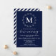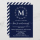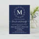 Elegante casa azul marino cálida invitación y cálida invitación a fiesta con una delicada corona botánica blanca, monograma con tipografía blanca. Personalizable líneas diagonales de blanco y azul marino en la parte posterior para un aspecto preppy moderno.