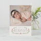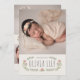 Tarjeta de anuncio de nacimiento moderna con cuatro insertos fotográficos, acompañados de caligrafía moderna y elementos florales en la parte posterior. ¡Este diseño moderno hará brillar la foto de tu bebé!