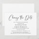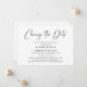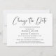 Anuncio minimalista moderno de aplazamiento de boda en negro y blanco. "Cambia la fecha" está escrito en una fuente elegante y puedes personalizar fácilmente con los detalles del aplazamiento de la boda.