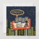 El diseño cuenta con ilustraciones divertidas de edificios de la ciudad bajo un cielo estrellado.