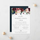 Elegante arreglo floral de acuarela en rojo borgoña, rosa rubor, azul marino y verdes exuberantes, invitación a la cena de ensayo. Diseño de tipografía chic y moderno. La parte trasera de la tarjeta presenta un color azul marino oscuro sólido.