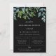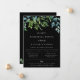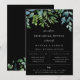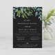Arreglos modernos de vegetación acuarela botánica en tonos de verde y azul, invitación a la cena de ensayo. Diseño de tipografía chic y moderno. El fondo presenta un color negro clásico sólido.