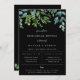Arreglos modernos de acuarela botánica en tonos de verde y azul, invitación para la cena de ensayo. Diseño de tipografía chic y moderno. El fondo presenta un color negro clásico sólido.