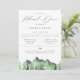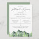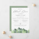 Árboles de acuarela rústica y escena montañosa, invitación a la cena de ensayo. Moda y diseño moderno de tipografía. El fondo presenta un color verde sabio sólido.
