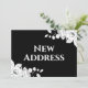 Tarjeta de anuncio de mudanza de dirección nueva floral en negro y blanco moderno y chic. Fondo negro chic, decorado con un delicado y moderno arreglo floral blanco de estilo esbozado en la esquina superior derecha e inferior izquierda. Combinación de fuente chic de caligrafía elegante y tipografía blanca serif.