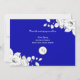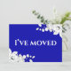 Tarjeta de anuncio de mudanza floral azul real blanco moderno y elegante. Fondo azul real chic, decorado con un delicado y moderno arreglo floral blanco de estilo esbozado en la esquina superior derecha y la esquina inferior izquierda. Combinación de fuente chic de caligrafía elegante y tipografía serif blanca.