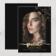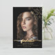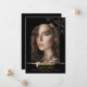 Tarjeta de anuncio de graduación con tema negro y dorado moderno, que presenta una foto arqueada, follaje de plantilla dorada chic y una flor. La tarjeta viene con una plantilla de texto que se puede editar fácilmente, los estilos de fuente se pueden cambiar haciendo clic en el enlace personalizar más después de personalizar.