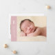 Este moderno anuncio de nacimiento presenta un minimalista monograma y una gran foto en el frente. El nombre completo de su bebé, la fecha de nacimiento y las estadísticas de nacimiento también aparecen en la parte delantera de la tarjeta. El monograma y los detalles del nacimiento se escriben en blanco sobre un fondo rosado bonito. La parte posterior de la tarjeta incluye una segunda foto y un espacio para escribir un mensaje personal a la familia y amigos.
