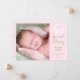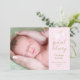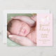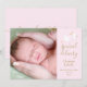 Con una linda cigüeña que lleva una entrega muy especial, sobre un suave fondo rosa, estas tarjetas de anuncio de nacimiento son perfectas para contar a todos tus noticias especiales. Personaliza con la foto de tu bebé y detalles en texto dorado chic. El reverso presenta un hermoso mensaje de escritura y sus nombres en texto dorado. Diseñado por Thisisnotme