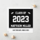 Esta invitación de graduación en blanco y negro dice 'Clase de 2022' en texto blanco grande. (Puede cambiar el año si lo necesita). Hay un texto que puedes editar para mostrar el nombre del graduado. Los gorros de los graduados blancos están a ambos lados de la frase "Clase de". En la parte inferior, hay una línea de texto negro para que el personalizado guarde el mensaje de fecha.