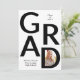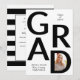 Clase GRAD moderna en blanco y negro de 2025 con invitación de graduación fotográfica. Incluye el texto "GRAD", una foto en la letra D y rayas en blanco y negro en la parte posterior.