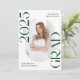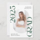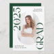 Anunciar el gran logro del graduado con estilo con esta moderna invitación de graduación fotográfica. El diseño de moda presenta "Clase de 2025 Grad" en letras verdes en negrita con acentos de escritura sutiles con un fondo blanco sólido. La foto vertical del graduado se muestra dentro de un marco oblongo en el centro de la invitación. Personalice el frente de la invitación de graduación verde con el nombre y la escuela del graduado. La invitación se invierte para mostrar una foto adicional mostrada dentro de un marco cuadrado blanco con el texto personalizado que se muestra a continuación. La elegante invitación de graduación es perfecta para graduados de secundaria y universitarios.