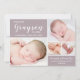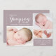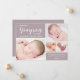 Simple y moderno anuncio de nacimiento para compartir las noticias de la llegada de su bebé. El polvoriento frente púrpura presenta un collage de 4 fotos con el nombre del bebé en una moderna escritura de tipografía blanca. Todos los demás detalles clave incluyendo fecha de nacimiento, estadísticas de nacimiento, nombres de padres están en una simple tipografía blanca. El lado inverso se coordina en un color púrpura coincidente