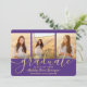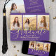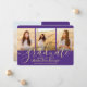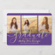 Comparte la alegría de una graduación de secundaria o universitaria con estas invitaciones personalizado 4 de collage de fotos moradas y doradas. Todas las imágenes y la redacción son simples de personalizar. (IMAGEN PLACEMENT TIP: Una manera fácil de centrar una foto exactamente como quieres es recortarla antes de subirla al sitio web de Zazzle.) Esta plantilla se puede personalizar con cualquier detalle de su elección, como información sobre la invitación a la fiesta, los nombres de los padres, los honores especiales, el título del título, la cita inspiradora favorita, la información de contacto del graduado, los planes de educación futuros o la nueva posición laboral. El diseño presenta un fondo morado, un gorro de tablero de mortero de Relieve metalizado falso, caligrafía de escritura a mano, tipografía minimalista moderna y cuatro fotos de su elección, como imágenes senior o de la ceremonia de inicio. Tenga en cuenta que el oro es color impreso, no Relieve metalizado metálico. Estas elegantes tarjetas de invitación de graduación son una forma moderna y moda de compartir tu celebración especial del día con la familia y amigos. ¡Felicitaciones al graduado!