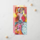 Colorido, caprichoso y vibrante personaje veneciano de mascarada. Sofisticada mujer rubia está sentada con una máscara de plumas en la mano con brillantes telas doradas, plateadas, azules, verde azuladas de un barroco disfraz de pelota enmascarada con plumas y una rosa roja dorada de colores blancos, rosados y amarillos.