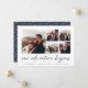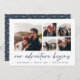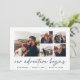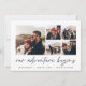 Una moderna y emocionante tarjeta de invitación de compromiso para la pareja con mente aventurera, este diseño limpio y sencillo presenta cinco fotos cuadradas en un diseño de collage de rejilla, con "nuestra aventura comienza" bajo escritura con letras a mano. Personalice con su invitación, nombres y detalles adicionales a lo largo de la parte inferior.