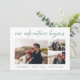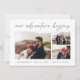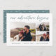 Una moderna y emocionante tarjeta de invitación de compromiso para la pareja con mente aventurera, este diseño limpio y simple presenta tres fotos horizontales o orientadas al paisaje en un diseño de collage de cuadrícula, con "nuestra aventura comienza" arriba en escritura con letras a mano. Personalice con su invitación, nombres y detalles adicionales a lo largo de la parte inferior.