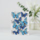 Composición vertical de mariposas morfo realistas, azules y blancas sobre fondo texturado gris. Mariposa morfo azul.