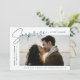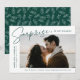 Comparte la noticia de tu sorprendente compromiso con estas elegantes invitaciones de compromiso fotográfico. El diseño incluye la frase "¡Sorpresa, nos comprometimos!" en un moderno guión verde oscuro y letras modernas. Su foto de compromiso se muestra en la parte central derecha del diseño con sus nombres y fecha de compromiso mostrados a la izquierda. Personalice la invitación de compromiso sorpresa añadiendo más detalles a continuación, como ciudad/estado boda, sitio web boda, etc. La invitación se invierte para mostrar un patrón follaje blanco sobre un fondo verde oscuro.