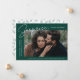 Comparte la noticia de tu sorprendente compromiso con estas elegantes invitaciones de compromiso fotográfico. El diseño incluye la frase "¡Sorpresa, nos comprometimos!" en un moderno guión en blanco y letras modernas sobre un fondo verde oscuro. Su foto de compromiso se muestra en la parte central derecha del diseño con sus nombres y fecha de compromiso mostrados a la izquierda. Personalice la invitación de compromiso sorpresa añadiendo más detalles a continuación, como ciudad/estado boda, sitio web boda, etc. La invitación se invierte para mostrar un patrón follaje verde oscuro sobre un fondo blanco.