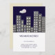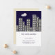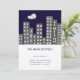 Acuarela que mueve invitación con un ilustracion una noche de edificios de apartamentos en la ciudad. Personalice el texto con su propio texto. Ilustrado y diseñado por Patricia Álvarez.